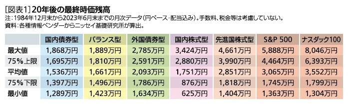また、レポートでは、最終的な時価残高のバラツキについても分析しています。バラツキとは、最終的な時価残高が平均値からどれだけ離れているかを表す指標で、投資のリスクを表しています。レポートの試算結果によると、バランス型のバラツキは314万円で最も小さく、ナスダック100のバラツキは4,594万円で最も大きいことが分かります。しかし、レポートでは、バラツキが大きくても、最終的な時価残高の増加のメリットを台無しにするほどではないと指摘しています。つまり、長期の資産形成においては、短期的なリスクの大小よりも、リターンの大小を重視すべきであるということです。