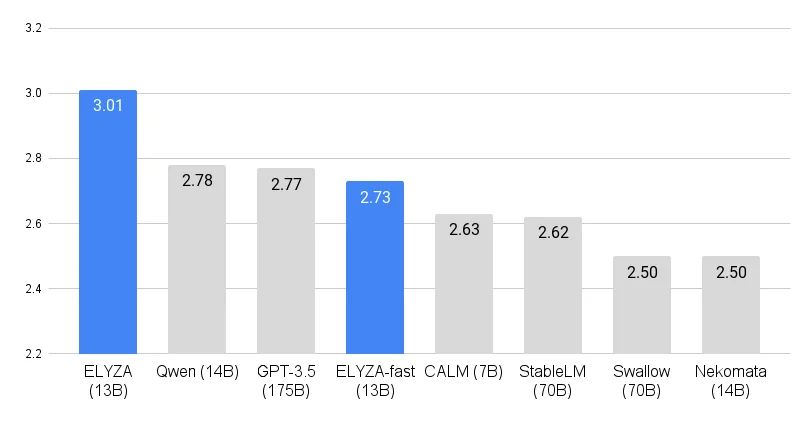 - 130億パラメータで高性能:パラメータ数が130億に増加し、ELYZA独自の日本語ベンチマークで最高のスコアを獲得しました。1750億パラメータのGPT-3.5を上回る性能を達成しました。