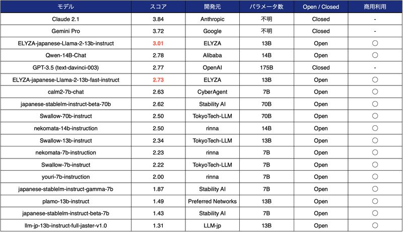 - モデルの概要:Meta社の「Llama 2 13B」をベースに、日本語テキストで追加事前学習を行ったモデル。商用利用可能で、ELYZA Tasks 100という日本語ベンチマークで最高性能を達成した。